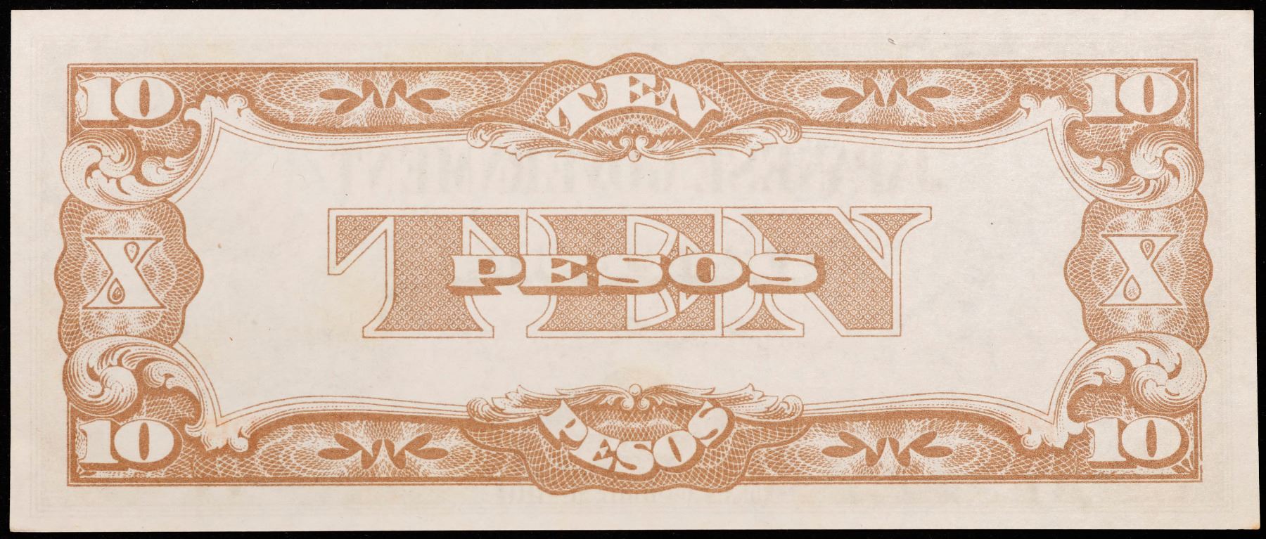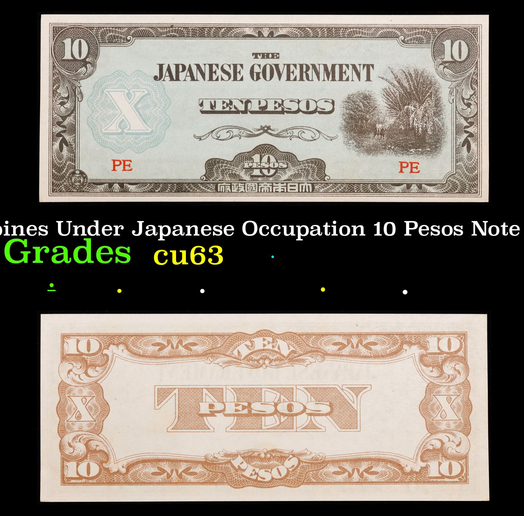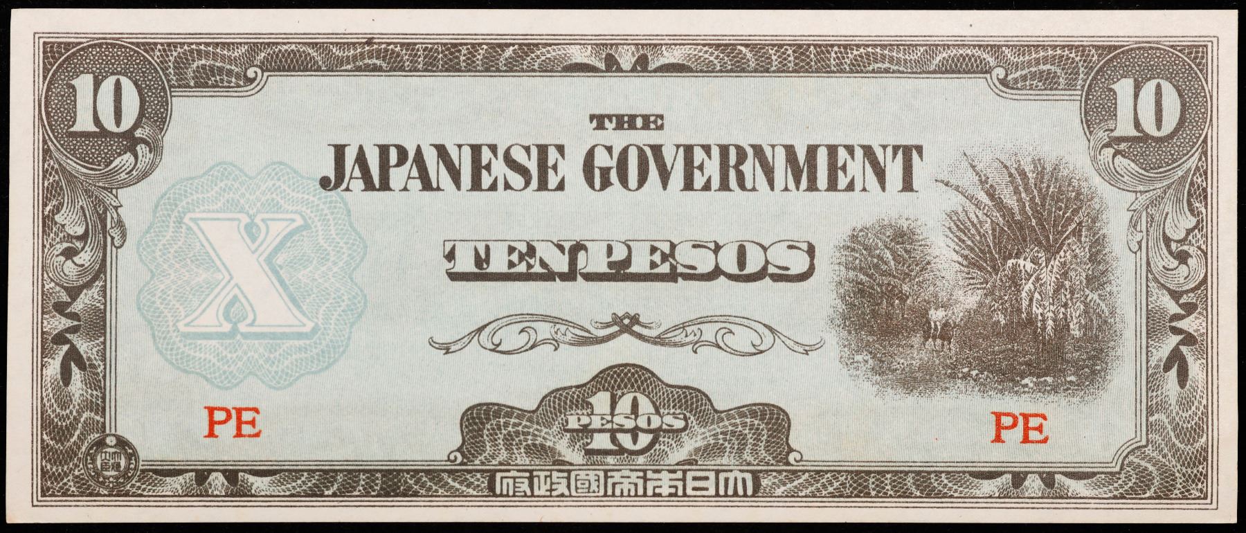 1942 Philippines Under Japanese Occupation 10 Pesos Note (JIM) P# 108A Grades Select CU. Japanese invasion money, officially known as Southern Development Bank Notes (Japanese: ??????? Dai T?-A Sens? gunpy?, "Greater East Asia War military scrip"), was currency issued by the Japanese Military Authority as a replacement for local currency after the conquest of colonies and other states in World War II. Japan printed this currency for many countries, including Malaysia, Singapore, North Borneo, Sarawak, Burma, Brunei, and several Oceania territories controlled by Australia.