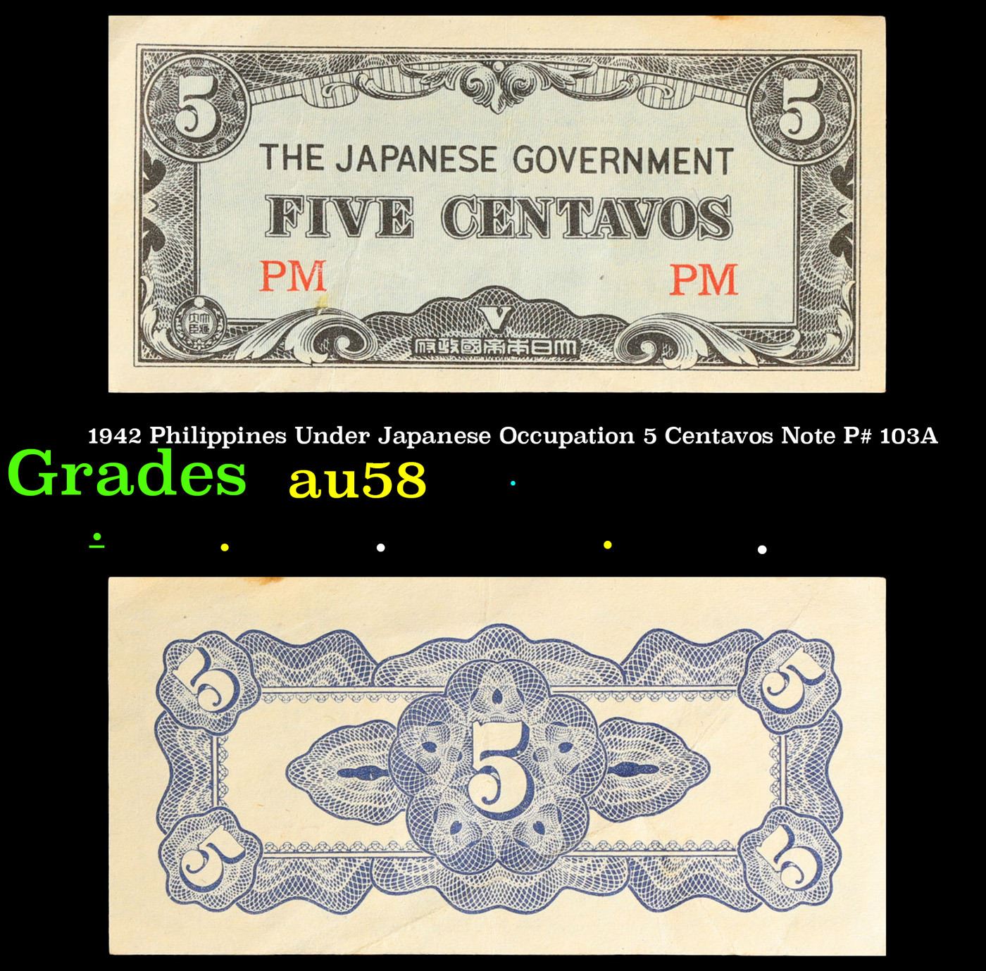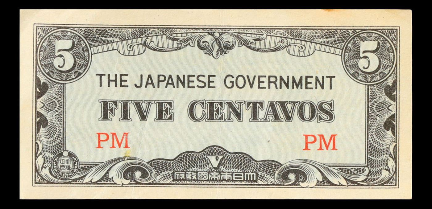 1942 Philippines Under Japanese Occupation 5 Centavos Note P# 103A Grades Choice AU/BU Slider. Japanese invasion money, officially known as Southern Development Bank Notes (Japanese: ??????? Dai T?-A Sens? gunpy?, "Greater East Asia War military scrip"), was currency issued by the Japanese Military Authority as a replacement for local currency after the conquest of colonies and other states in World War II. Japan printed this currency for many countries, including Malaysia, Singapore, North Borneo, Sarawak, Burma, Brunei, and several Oceania territories controlled by Australia.