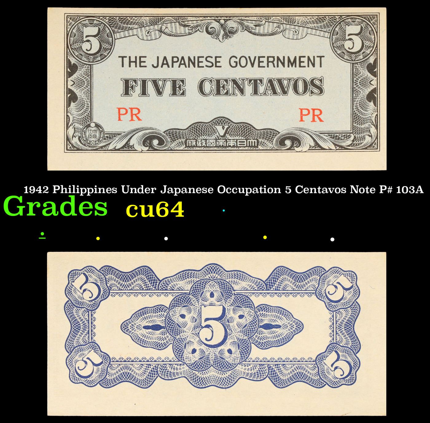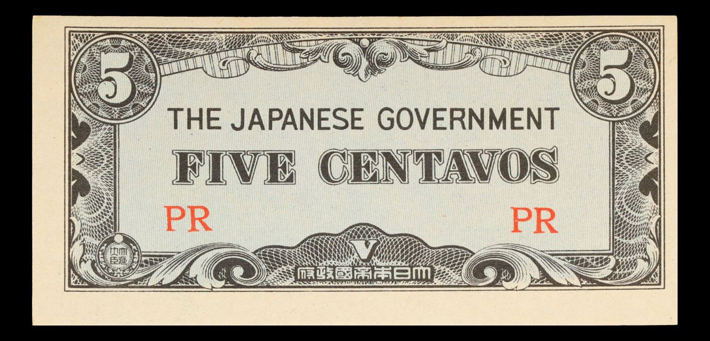 1942 Philippines Under Japanese Occupation 5 Centavos Note P# 103A Grades Choice CU. Japanese invasion money, officially known as Southern Development Bank Notes (Japanese: ??????? Dai T?-A Sens? gunpy?, "Greater East Asia War military scrip"), was currency issued by the Japanese Military Authority as a replacement for local currency after the conquest of colonies and other states in World War II. Japan printed this currency for many countries, including Malaysia, Singapore, North Borneo, Sarawak, Burma, Brunei, and several Oceania territories controlled by Australia.
