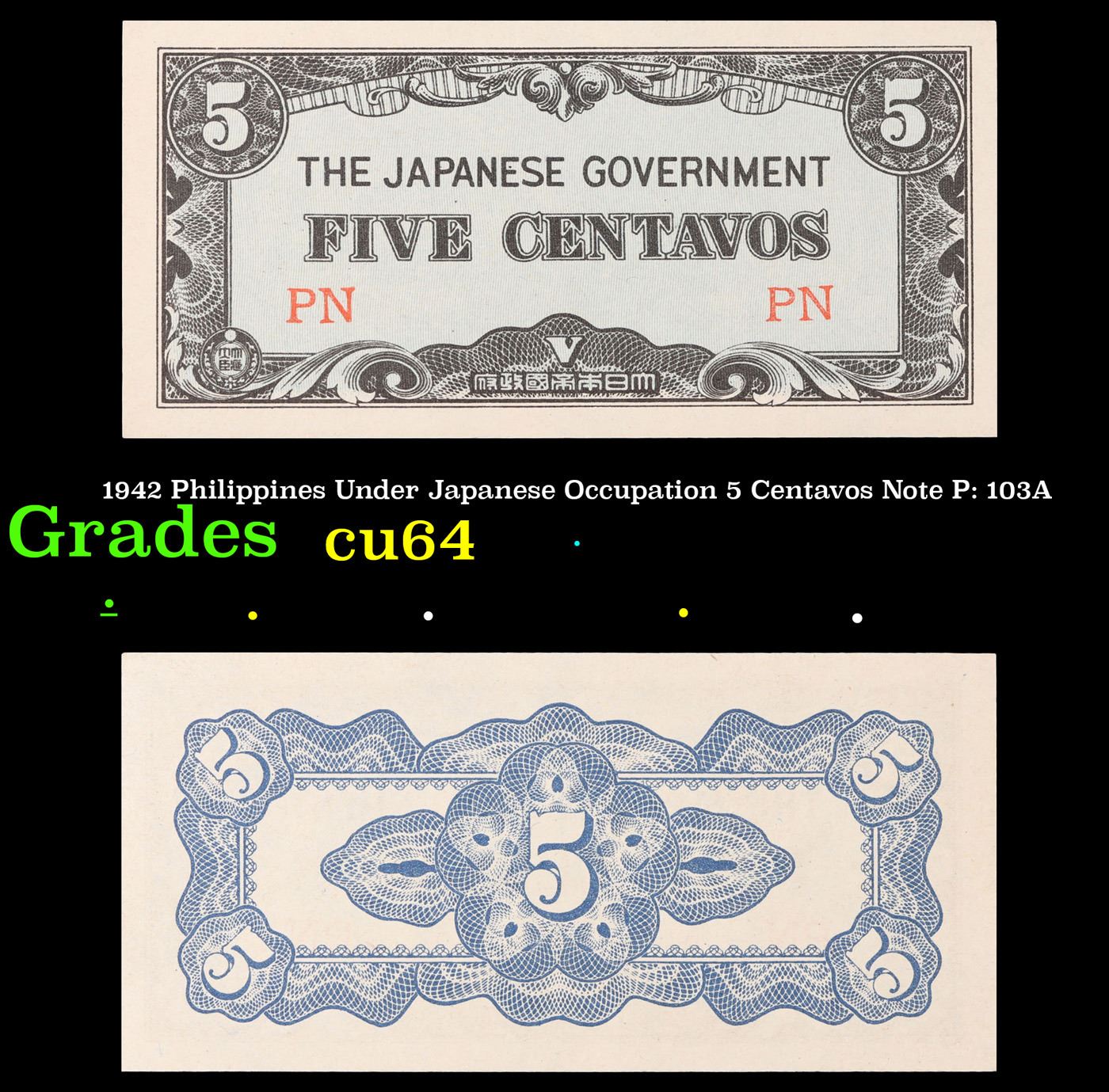 1942 Philippines Under Japanese Occupation 5 Centavos Note P: 103A Grades Choice CU