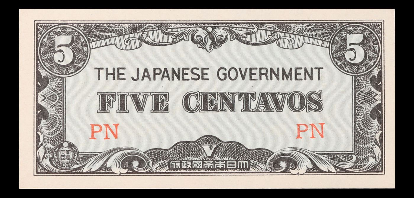 1942 Philippines Under Japanese Occupation 5 Centavos Note P: 103A Grades Choice CU. Japanese invasion money, officially known as Southern Development Bank Notes (Japanese: ??????? Dai T?-A Sens? gunpy?, "Greater East Asia War military scrip"), was currency issued by the Japanese Military Authority as a replacement for local currency after the conquest of colonies and other states in World War II. Japan printed this currency for many countries, including Malaysia, Singapore, North Borneo, Sarawak, Burma, Brunei, and several Oceania territories controlled by Australia.