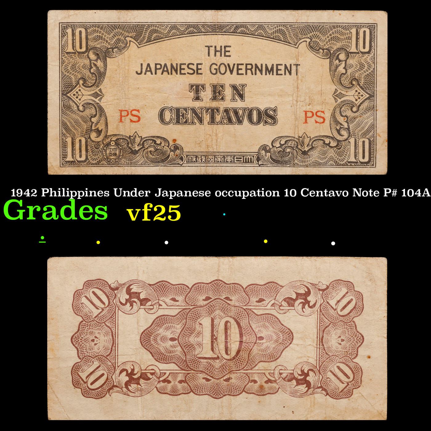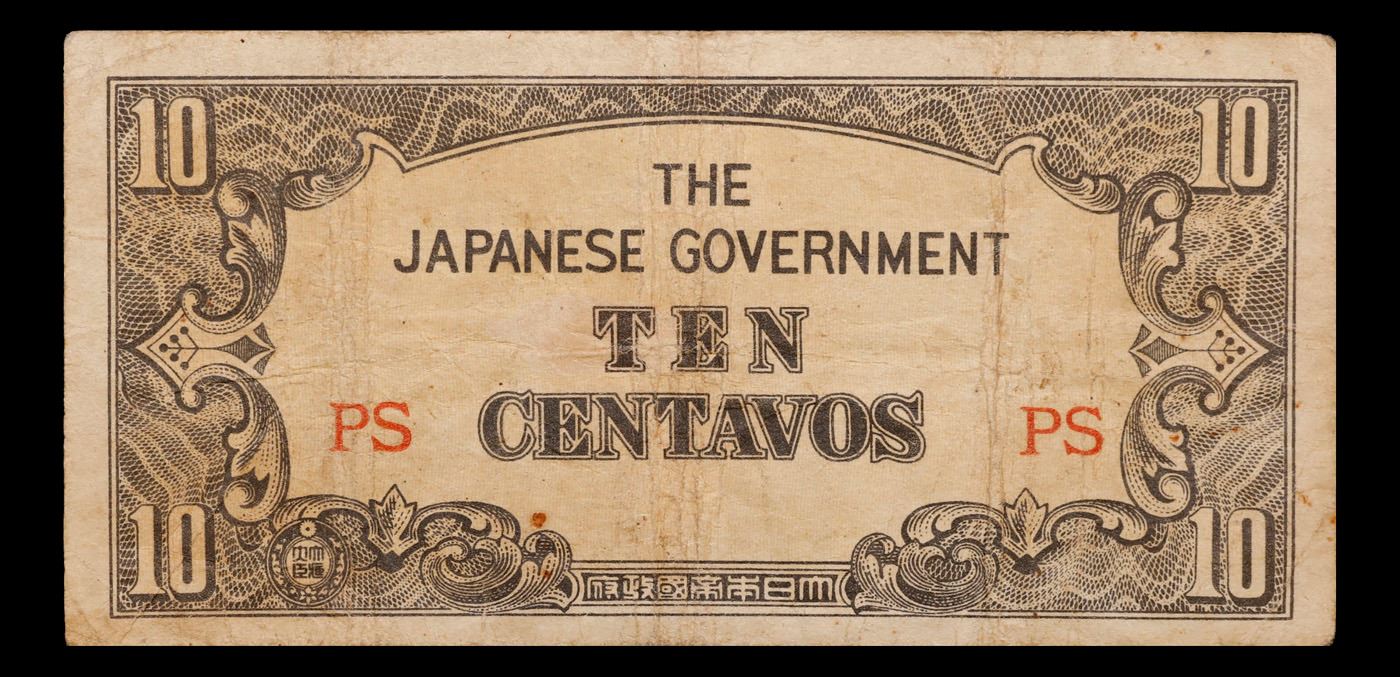 1942 Philippines Under Japanese occupation 10 Centavo Note P# 104A Grades vf+. Japanese invasion money, officially known as Southern Development Bank Notes (Japanese: ??????? Dai T?-A Sens? gunpy?, "Greater East Asia War military scrip"), was currency issued by the Japanese Military Authority as a replacement for local currency after the conquest of colonies and other states in World War II. Japan printed this currency for many countries, including Malaysia, Singapore, North Borneo, Sarawak, Burma, Brunei, and several Oceania territories controlled by Australia.