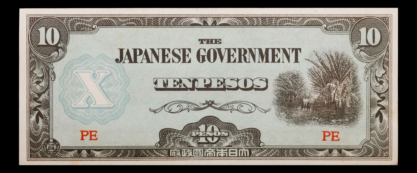 1942 Philippines Under Japanese occupation 10 Peso Note P# 108A Grades Select CU. Japanese invasion money, officially known as Southern Development Bank Notes (Japanese: ??????? Dai T?-A Sens? gunpy?, "Greater East Asia War military scrip"), was currency issued by the Japanese Military Authority as a replacement for local currency after the conquest of colonies and other states in World War II. Japan printed this currency for many countries, including Malaysia, Singapore, North Borneo, Sarawak, Burma, Brunei, and several Oceania territories controlled by Australia.