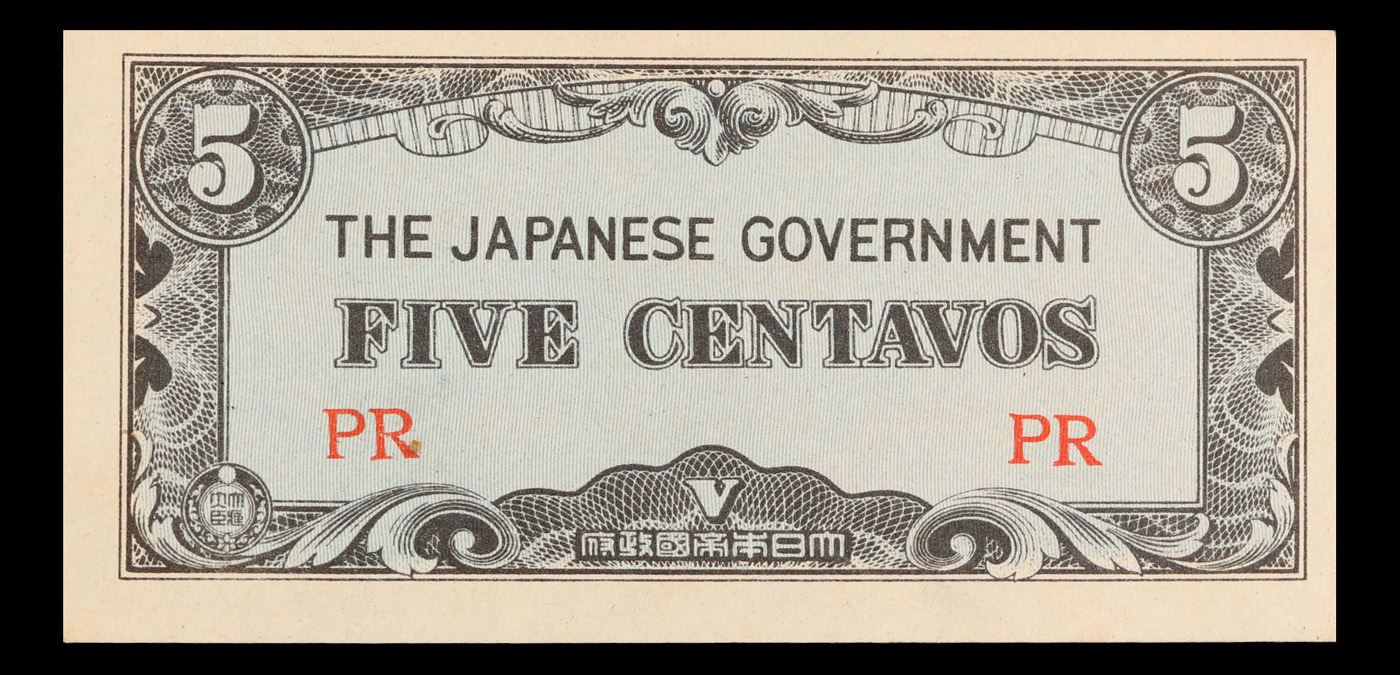 1942 Philippines Under Japanese occupation 5 Centavo Note P# 103A Grades Gem CU. Japanese invasion money, officially known as Southern Development Bank Notes (Japanese: ??????? Dai T?-A Sens? gunpy?, "Greater East Asia War military scrip"), was currency issued by the Japanese Military Authority as a replacement for local currency after the conquest of colonies and other states in World War II. Japan printed this currency for many countries, including Malaysia, Singapore, North Borneo, Sarawak, Burma, Brunei, and several Oceania territories controlled by Australia.