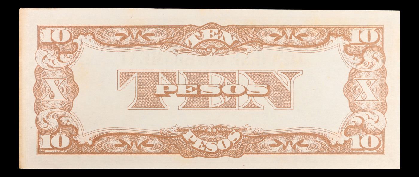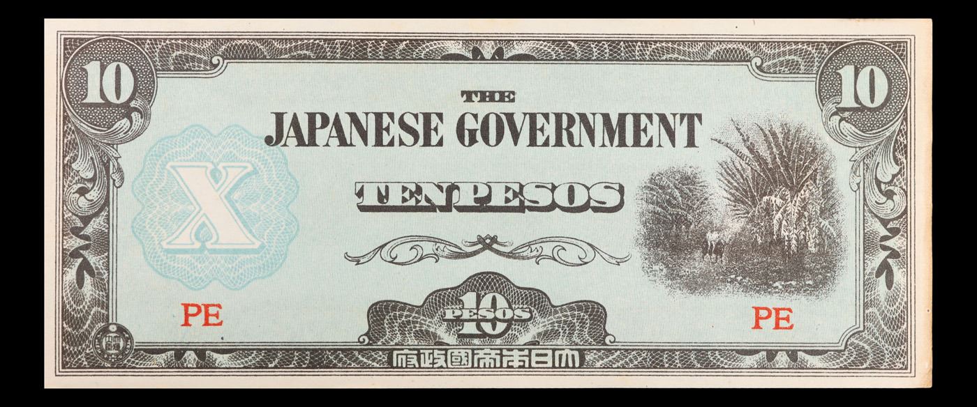 1942 Philippines Under japanese Occupation 10 Peso note P# 108A Grades Select CU. Japanese invasion money, officially known as Southern Development Bank Notes (Japanese: ??????? Dai T?-A Sens? gunpy?, "Greater East Asia War military scrip"), was currency issued by the Japanese Military Authority as a replacement for local currency after the conquest of colonies and other states in World War II. Japan printed this currency for many countries, including Malaysia, Singapore, North Borneo, Sarawak, Burma, Brunei, and several Oceania territories controlled by Australia.