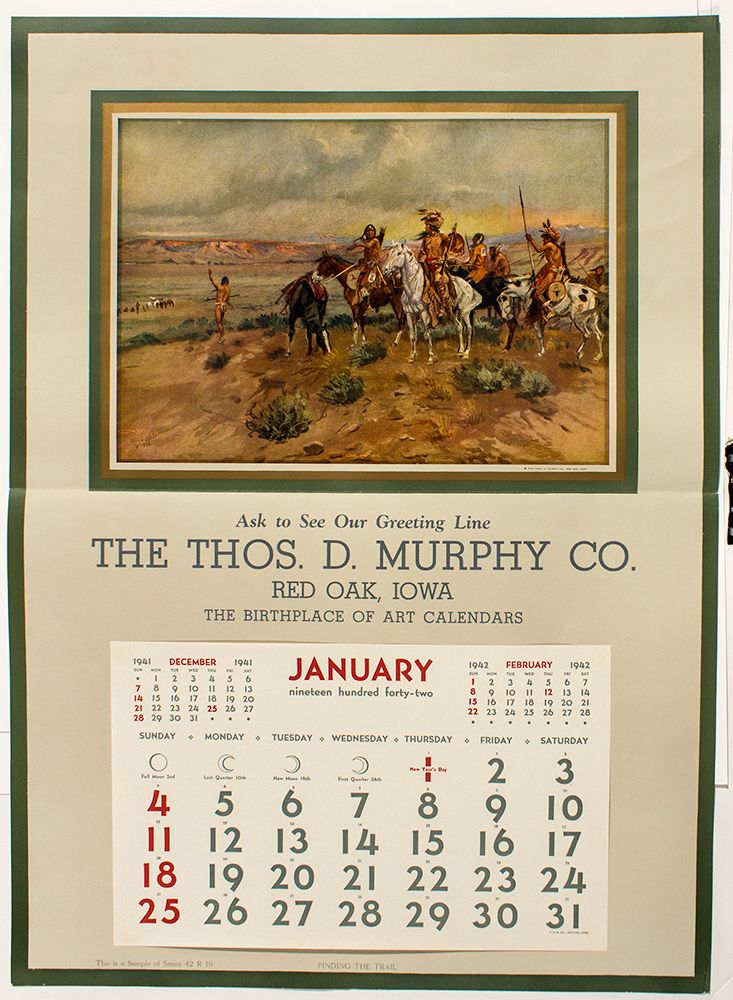 c1942 This is a 26"x 40" calendar broadside from Thomas Murphy & Company. It is embellished with the Chas. Russell print "Finding the Trail." It's in very good condition. - HKA#65947