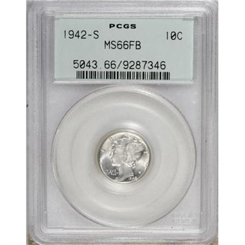 <B>1942-S 10C MS66 Full Bands PCGS.</B></I> PCGS Population (397/93). NGC Census: (226/69). Mintage: 49,300,000. Numismedia Wsl. Price for NGC/PCGS coin in MS66: $124. (#5043)<BR><BR><B>Coin Engraver:</B> Adolph A. Weinman<BR><BR><b>Shipping:</b> Coins & Currency (<a target="_blank" href="http://www.heritageauctions.com/common/shipping.php">view shipping information</a>)