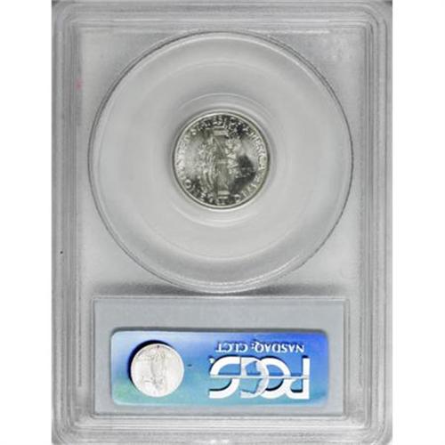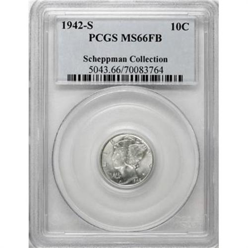 <B>1942-S 10C MS66 Full Bands PCGS.</B></I> Subtle blue and canary-gold accents visit the reverse, while the obverse remains minimally toned by comparison. Shining and slightly satiny with wonderful preservation, even by the standards of the grade.<BR><I>From The Scheppman Collection, #4 PCGS Registry of Full Band Mercury Dimes.</B></I><BR><BR><B>Coin Engraver:</B> Adolph A. Weinman<BR><BR><b>Shipping:</b> Coins & Currency (<a target="_blank" href="http://www.heritageauctions.com/common/shipping.php">view shipping information</a>)