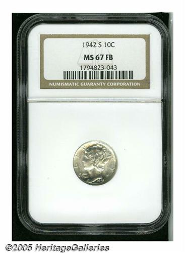 <B>1942-S<10C> MS67 Full Bands NGC.</B></I> Large S. A lustrous and fully brilliant Superb Gem, the strike is exacting in the centers and shows only a hint of softness on the tops of a few peripheral letters. The undisturbed surfaces appear the same today as the did when the coin first fell from dies during World War II.