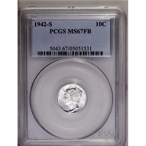 <B>1942-S<10C> MS67 Full Bands PCGS.</B></I> A lustrous and fully brilliant Superb Gem, the strike is exacting in the centers and shows only a hint of softness on the tops of a few peripheral letters. The undisturbed surfaces appear the same today as the did when the coin first fell from dies during World War II. Population: 77 in 67 Full Bands, 1 finer (5/06).