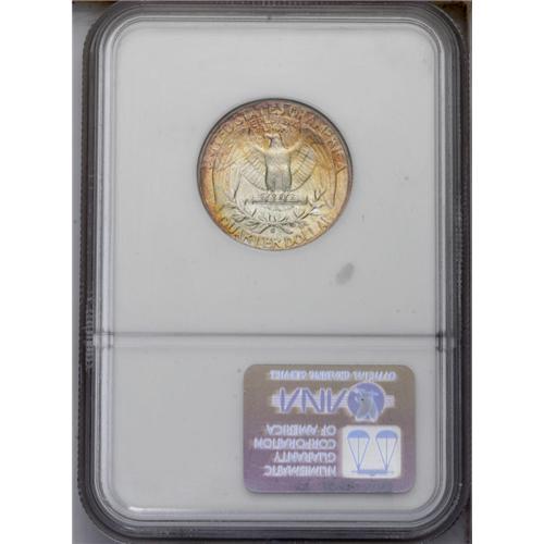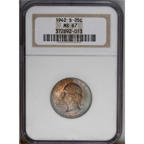 <B>1942-S<25C> MS67 NGC.</B></I> Dazzling luster radiates from both sides of his sharply struck Washington quarter. The obverse is overlain with a deep melange of orange, lavender, and electric-blue toning, while the reverse shows iridescent orange, crimson, and powder-blue. A few minute linear marks are concealed within the toning in the left (facing) obverse field and on the eagle's torso. Census: 54 in 67, 0 finer (1/06).<BR><I>From The Houston Collection of Washington Quarters.</B></I>