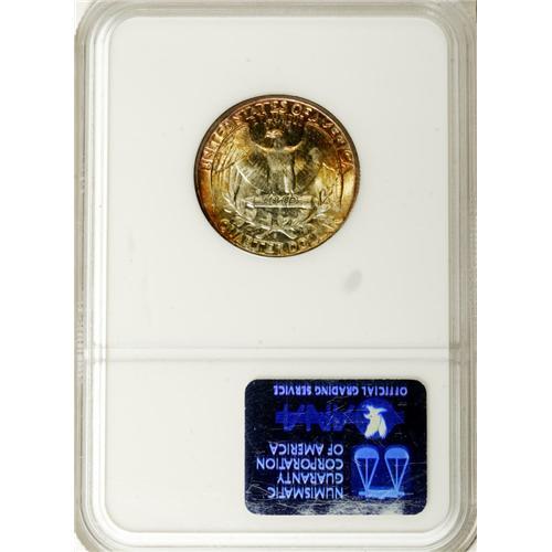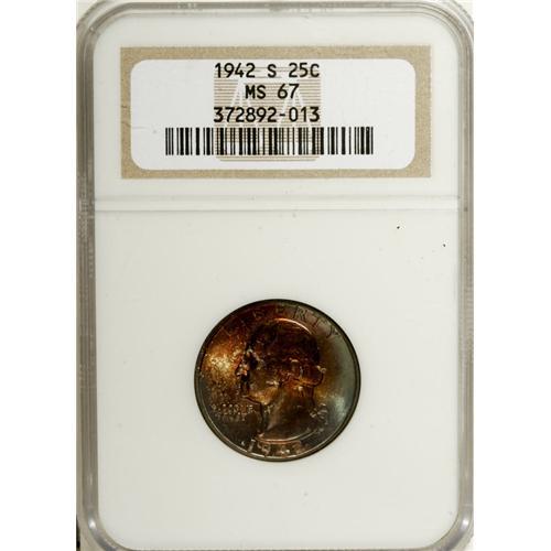 <B>1942-S 25C MS67 NGC.</B></I> Highly lustrous and sharply struck. Blue-violet, pink, and fiery reddish-orange patina covers the obverse, while the reverse has sunset-orange above and gold at the periphery, and the area around the perch is untoned. Tied for the finest certified by NGC (12/06).<BR><BR><b>Shipping:</b> Coins & Currency (<a target="_blank" href="http://www.heritageauctions.com/common/shipping.php">view shipping information</a>)