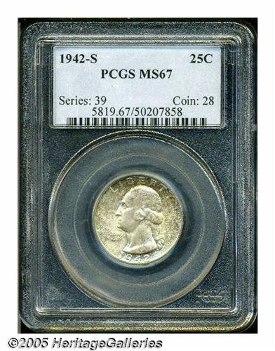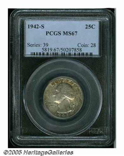 <B>1942-S<25C> MS67 PCGS.</B></I> Exceptionally clean for the grade with fantastic luster and frosty surfaces. An array of pleasant multicolored patina overlays each side of this pristine Gem. Population: 21 in 67, 1 finer (5/05).