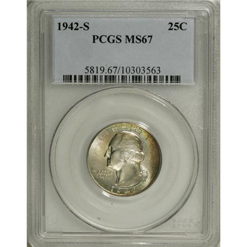 1942-S 25C MS67 PCGS. Iridescent gold, ice-blue, and g