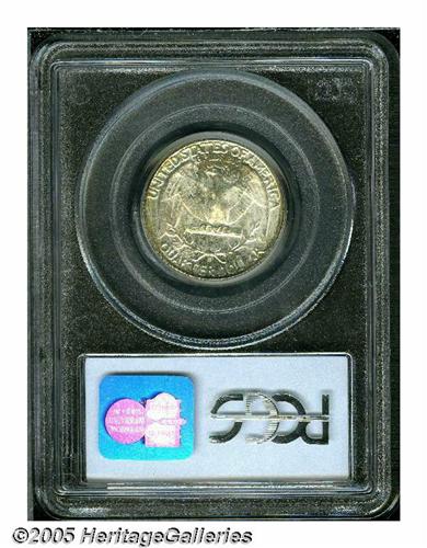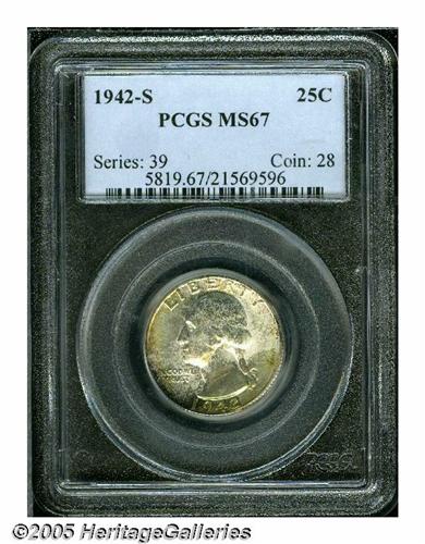 <B>1942-S<25C> MS67 PCGS.</B></I> Lovely lemon, sky-blue, and golden-brown colors frequent the borders of this highly lustrous and crisply struck Superb Gem. The reverse is immaculate, and the obverse is nearly as well preserved. Trumpet tail mintmark, one of two mintmark styles in use at San Francisco for 1942. The 1942-S is a decidedly better date within the forties, especially in Mint State. Population: 22 in 67, 1 finer (6/05).