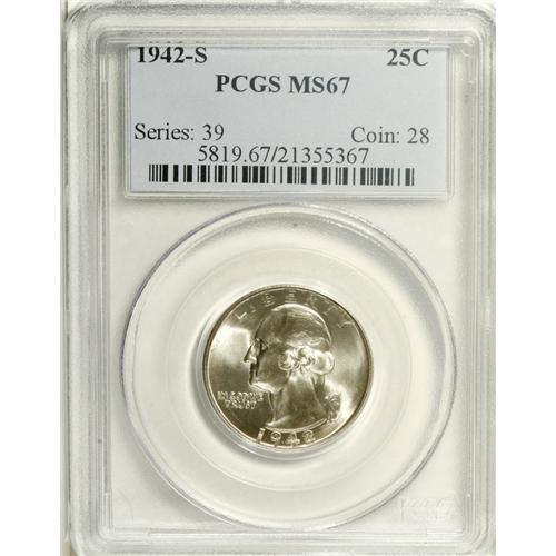 <B>1942-S 25C MS67 PCGS.</B></I> The blazing white luster that encompasses this Superb Gem is next to blemish- free, thus the grade. Hard to come by in this grade, this extremely attractive coin has seen only one example graded higher by PCGS (1/07).<BR><BR><b>Shipping:</b> Coins & Currency (<a target="_blank" href="http://www.heritageauctions.com/common/shipping.php">view shipping information</a>)