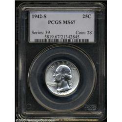 <table><tr><td><TABLE cellSpacing=0 cellPadding=0 width="100%" bgColor=#000000 border=0><TBODY> <TR><TD width="100%"><TABLE cellSpacing=1 cellPadding=3 width="100%" border=0><TBODY><TR><TD width="100%" bgColor=#79735c><FONT face=arial color=#ffffff size=3><B>Description</B> </FONT></TD></TR><TR><TD width="100%" bgColor=#ffffff><FONT face=arial size=2><B>1942-S 25C MS67 PCGS.</B></I> Radiant mint luster, the surfaces are fully brilliant and well defined overall. No mentionable marks are reported on either side. Population: 9 in 67, 0 finer (9/03). </FONT></TD></TR></TBODY></TABLE></TD></TR></TBODY></TABLE><BR><A name=PricesRealized></A><TABLE cellSpacing=0 cellPadding=0 width="100%" bgColor=#000000 border=0><TBODY><TR><TD width="100%"><TABLE cellSpacing=1 cellPadding=3 width="100%" border=0><TBODY><TR><TD width="100%" bgColor=#79735c><A name=PR><FONT face=arial color=#ffffff size=3><B>Previous Prices from Heritage Auctions</B> </FONT></A></TD></TR><TR><TD bgColor=#f6f6ed><TABLE cellSpacing=0 cellPadding=0 width="100%" border=1><TBODY><TR><TD align=middle width="33%"><B>Date</B></TD><TD align=middle width="33%"><B>Service</B></TD><TD align=middle width="33%"><B>Price</B></TD></TR><TR bgColor=whitesmoke><TD width="33%"><B>07/29/2003</B></TD><TD width="33%">PCGS</TD><TD width="33%">$2,415.00</TD></TR><TR bgColor=whitesmoke><TD width="33%"><B>03/01/2003</B></TD><TD width="33%">NGC</TD><TD width="33%">$1,725.00</TD></TR><TR bgColor=whitesmoke><TD width="33%"><B>03/01/2003</B></TD><TD width="33%">NGC</TD><TD width="33%">$1,150.00</TD></TR><TR bgColor=whitesmoke><TD width="33%"><B>02/23/2002</B></TD><TD width="33%">PCGS</TD><TD width="33%">$2,415.00</TD></TR><TR bgColor=whitesmoke><TD width="33%"><B>05/31/2001</B></TD><TD width="33%">PCGS</TD><TD width="33%">$747.50</TD></TR><TR bgColor=whitesmoke><TD width="33%"><B>04/07/2001</B></TD><TD width="33%">NGC</TD><TD width="33%">$471.50</TD></TR><TR bgColor=whitesmoke><TD width="33%"><B>02/23/2001</B></TD><TD width="33%">PCGS</TD><TD width="33%">$1,092.50</TD></TR><TR bgColor=whitesmoke><TD width="33%"><B>01/04/1995</B></TD><TD width="33%">PCGS</TD><TD width="33%">$495.00</TD></TR></TBODY></TABLE></TD></TR><TR><TD bgColor=#ffffff><FONT face=arial size=1 ?>PLEASE NOTE: All prices realized reflect the final hammer price PLUS the buyer's premium in auctions that charge a buyer's premium. Each item has a notation at the top of the listing indicating whether that lot included a buyer's premium. Example: A item that sells with a final hammer price of $100 and a 20% buyer's premium will display with a price realized of $120. All information listed is intended to be as accurate as possible, but errors are possible. Please use this guide carefully and inform us of any inaccuracies. </FONT></TD></TR></TBODY></TABLE></TD></TR></TBODY></TABLE><BR><TABLE cellSpacing=0 cellPadding=0 width="100%" bgColor=#000000 border=0><TBODY><TR><TD width="100%"><TABLE cellSpacing=1 cellPadding=3 width="100%" border=0><TBODY><TR><TD width="100%" bgColor=#79735c colSpan=6><FONT face=arial color=#ffffff size=3><B>Price Guide*</B> </FONT></TD></TR><TR bgColor=#f6f6ed><TD align=middle><B>Grade</B> </TD><TD align=middle><B>Coin World<BR>(Trends)</B> </TD><TD align=middle><B>Numismedia<BR>Retail</B> </TD><TD align=middle><B>Numismedia<BR>Wholesale</B> </TD><TD align=middle><B>Coin<BR>Universe</B> </TD><TD align=middle><B>Heritage<BR>Value Index</B> </TD></TR><TR bgColor=#ffffff><TD align=middle>66</TD><TD align=right>---</TD><TD align=right>$190.00</TD><TD align=right>$152.00</TD><TD align=right>$350.00</TD><TD align=right>$215.00</TD></TR><TR style="FONT-WEIGHT: bold" bgColor=#cccfdd><TD align=middle>67</TD><TD align=right>---</TD><TD align=right>$670.00</TD><TD align=right>$535.00</TD><TD align=right>$1,850.00</TD><TD align=right>$1,855.00</TD></TR><TR bgColor=#ffffff><TD align=middle>68</TD><TD align=right>---</TD><TD align=right>---</TD><TD align=right>---</TD><TD align=right>---</TD><TD align=right>---</TD></TR><TR bgColor=#ffffff><TD colSpan=6><FONT size=1>*All information listed is intended to be as accurate as possible, but errors are possible. No item may be returned or refused based on this information which is provided as a service to our customers. You should contact each pricing source directly to determine the accuracy of this information. </FONT></TD></TR></TBODY></TABLE></TD></TR></TBODY></TABLE><BR><TABLE cellSpacing=0 cellPadding=0 width="100%" bgColor=#000000 border=0><TBODY><TR><TD width="100%"><TABLE cellSpacing=1 cellPadding=3 width="100%" border=0><TBODY><TR><TD width="100%" bgColor=#79735c><FONT face=arial color=#ffffff size=3><B>Population Guide</B> </FONT></TD></TR><TR bgColor=#ffffff><TD align=middle><!-- Begin Output of Population Grid--><TABLE cellSpacing=0 cellPadding=0 width="100%" border=0><TBODY><TR><TD vAlign=center><TABLE cellSpacing=0 width="100%" border=1 cellsadding="3"><TBODY><TR><TD vAlign=center><TABLE cellSpacing=0 cellPadding=3 width="100%" border=1><TBODY><TR><TD vAlign=center align=middle bgColor=#f0f1e8 colSpan=2 <CENTER><FONT face=Arial size=2><B>PCGS Pop </B></FONT><CENTER></CENTER></TD><TD vAlign=center align=middle bgColor=#f0f1e8 colSpan=2><CENTER><FONT face=Arial size=2><B>NGC Pop</B></CENTER></FONT></TD></TR><TR><TD vAlign=center><FONT face=Arial size=2>(67)</FONT> </TD><TD vAlign=center align=right><FONT face=Arial size=2>17</FONT> </TD><TD vAlign=center><FONT face=Arial size=2>(67)</FONT> </TD><TD vAlign=center align=right><FONT face=Arial size=2>48</FONT> </TD></TR><TR><TD vAlign=center><FONT face=Arial size=2>(>67)</FONT> </TD><TD vAlign=center align=right><FONT face=Arial size=2>0</FONT> </TD><TD vAlign=center><FONT face=Arial size=2>(>67)</FONT> </TD><TD vAlign=center align=right><FONT face=Arial size=2>0</FONT> </TD></TR></TBODY></TABLE></TD></TR></TBODY></TABLE></TD></TR></TBODY></TABLE><!-- End Output of Population Grid--></TD></TR></TBODY></TABLE></TD></TR></TBODY></TABLE><BR><TABLE cellSpacing=0 cellPadding=0 width="100%"
