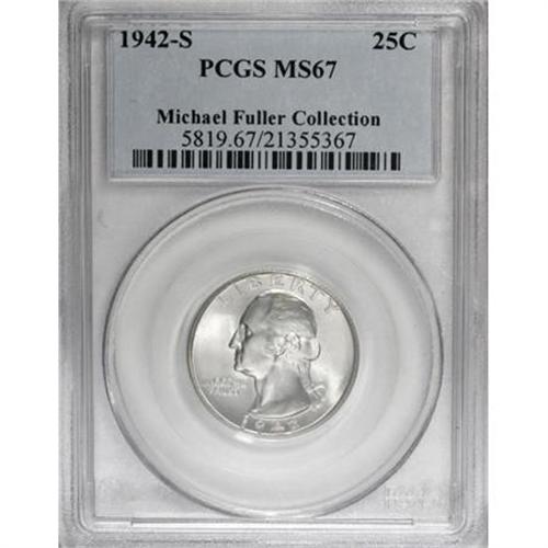 <B>1942-S 25C MS67 PCGS.</B></I> Trumpet tail S. A lustrous and nearly pristine Superb Gem of this wartime issue. Well struck in the centers with only minor spreading near the rims. Population: 24 in 67, 1 finer (8/07).<BR><I>From The Michael Fuller Collection.</B></I><BR><BR><B>Coin Engraver:</B> John Flanagan<BR><BR><b>Shipping:</b> Coins & Currency (<a target="_blank" href="http://www.heritageauctions.com/common/shipping.php">view shipping information</a>)