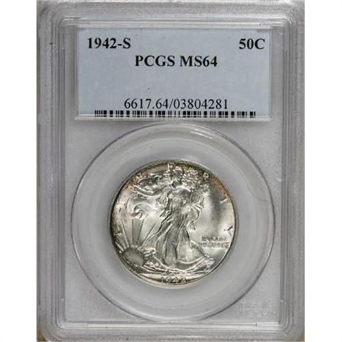 <B>1942-S 50C MS64 PCGS.</B></I> PCGS Population (2909/2197). NGC Census: (1827/1105). Mintage: 12,708,000. Numismedia Wsl. Price for NGC/PCGS coin in MS64: $100. (#6617)<BR><BR><B>Coin Engraver:</B> Adolph A. Weinman<BR><BR><b>Shipping:</b> Coins & Currency (<a target="_blank" href="http://www.heritageauctions.com/common/shipping.php">view shipping information</a>\)