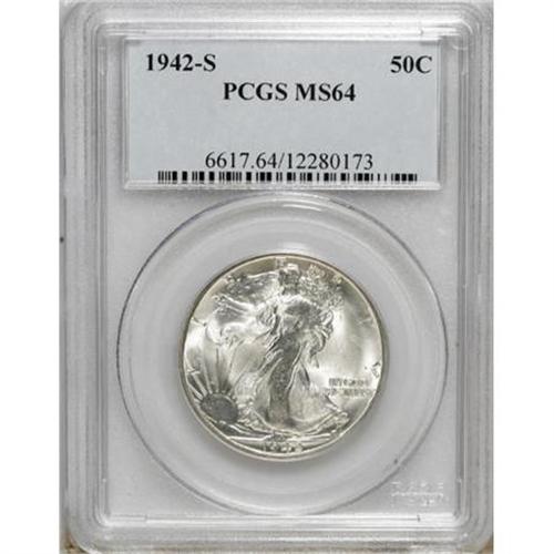 <B>1942-S 50C MS64 PCGS.</B></I> . PCGS Population (2986/2263). NGC Census: (1864/1119). Mintage: 12,708,000. Numismedia Wsl. Price for NGC/PCGS coin in MS64: $100. (#6617)<BR><BR><B>Coin Engraver:</B> Adolph A. Weinman<BR><BR><b>Shipping:</b> Coins & Currency (<a target="_blank" href="http://www.heritageauctions.com/common/shipping.php">view shipping information</a>)