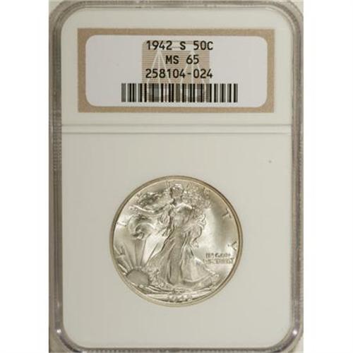 <B>1942-S 50C MS65 NGC.</B></I> NGC Census: (947/156). PCGS Population (1903/285). Mintage: 12,708,000. Numismedia Wsl. Price for NGC/PCGS coin in MS65: $460. (#6617)<BR><BR><b>Shipping:</b> Coins & Currency (<a target="_blank" href="http://www.heritageauctions.com/common/shipping.php">view shipping information</a>)