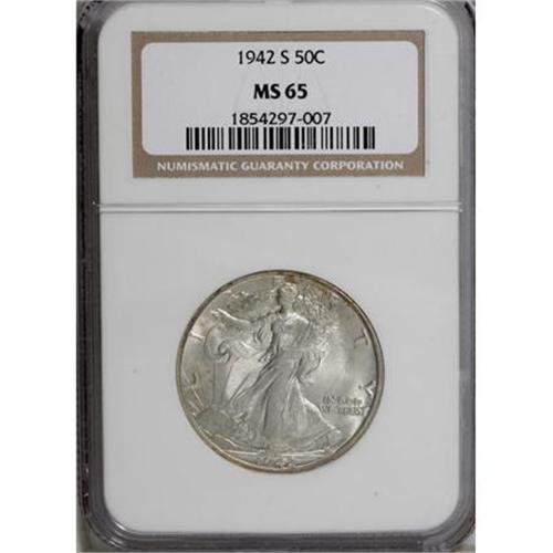 <B>1942-S 50C MS65 NGC.</B></I> NGC Census: (948/157). PCGS Population (1911/291). Mintage: 12,708,000. Numismedia Wsl. Price for NGC/PCGS coin in MS65: $464. (#6617)<BR><BR><B>Coin Engraver:</B> Adolph A. Weinman<BR><BR><b>Shipping:</b> Coins & Currency (<a target="_blank" href="http://www.heritageauctions.com/common/shipping.php">view shipping information</a>\)