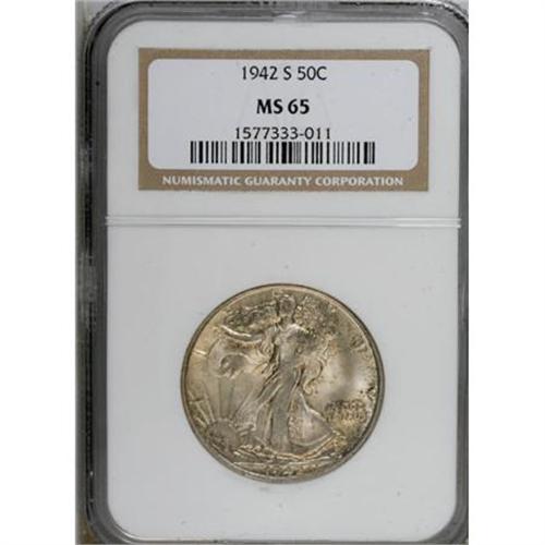 <B>1942-S 50C MS65 NGC.</B></I> NGC Census: (952/157). PCGS Population (1935/297). Mintage: 12,708,000. Numismedia Wsl. Price for NGC/PCGS coin in MS65: $464. (#6617)<BR><BR><B>Coin Engraver:</B> Adolph A. Weinman<BR><BR><b>Shipping:</b> Coins & Currency (<a target="_blank" href="http://www.heritageauctions.com/common/shipping.php">view shipping information</a>)