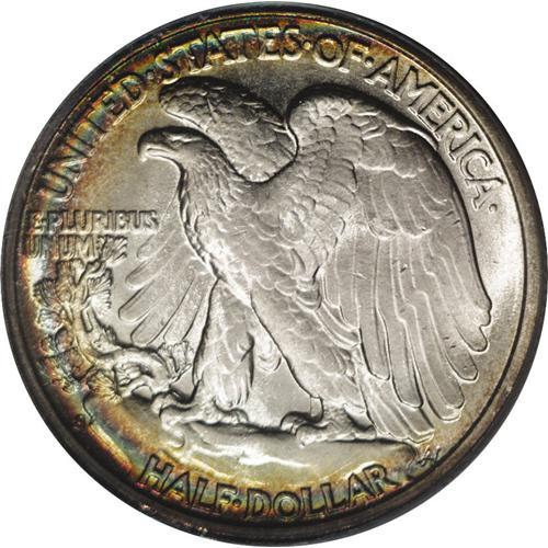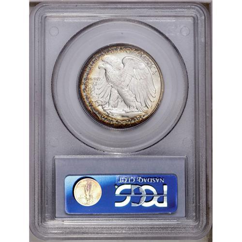 <B>1942-S<50C> MS65 PCGS.</B></I> A well struck Gem 1942-S, while a desirable grade for the collector assembling a short set of Walking Liberty halves, can be acquired without too much difficulty and at not too great a cost. This character-laden example distinguishes itself from the masses with colorful arcs of cobalt-blue and amber toning that are most prominent on the obverse. <BR><BR><B>Important notice:</B> Heritage usually auctions material at the rate of 200-250 lots per hour. On some occasions eBay Live bid software or the Internet may not be able to keep up with the pace of the auction. We recommend placing a realistic absentee bid now as insurance to avoid disappointment. Occasionally the auctioneer may eliminate or reject an eBay Live bid, and the auctioneer may also reopen a lot after the close of the eBay live bidding (usually because we missed an audience bid), and may reject your bid even if it shows you as the winning bidder. By bidding via eBay Live, you agree that Heritage may award the lot to another bidder at its sole discretion under the circumstances described above or any other reasonable circumstances. Since eBay bids are not shown to us until we open the lot on the floor, we treat those bids just like floor bids. In most cases the floor responds before the eBay bid is presented to us, due to Internet lag time, so for consistency we have made it a policy that floor bids are always considered first over tie eBay live bids. Also please note that all Heritage lots purchased through eBay Live carry a 20% Buyer's Premium. Please make sure you read the Terms and Conditions before you bid. This lot is being auctioned in conjunction with a live floor auction by Heritage Galleries & Auctioneers. All final auction and invoice information will be supplied by Heritage Galleries & Auctioneers, and all other information should be considered preliminary. Lot:2998 <BR><BR><B>Winning Notification and Billing:</B> After the FINAL session in this auction is complete, Heritage will send e-mail and snail mail invoices. This process normally takes several days. All final auction and invoice information will be supplied by Heritage Galleries & Auctioneers, and all other information should be considered preliminary. <BR><BR>This auction will be conducted on a live auction floor and over the Internet through eBay Live. If you choose to place an absentee bid, please take a moment to <font color='#0000ff'><u><a href='http://pages.ebay.com/liveauctions/help/before/laabsentee.html'>learn how eBay Live absentee bidding works</a></u></font><font color='#000000'>