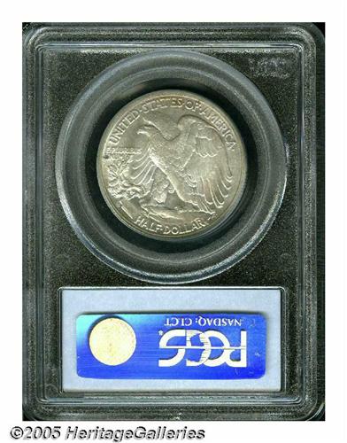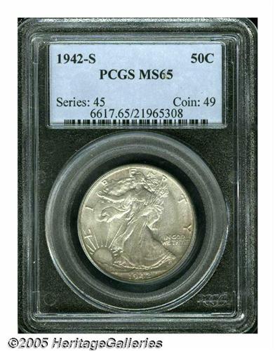 <B>1942-S<50C> MS65 PCGS.</B></I> Pale lavender and ice-blue patina roam over lustrous surfaces on both sides, but becomes somewhat more intense on the lower portion of the obverse. The design features are adequately struck, save for softness in Liberty's left hand area and on the eagle's left leg. Both faces are free of significant contact marks.