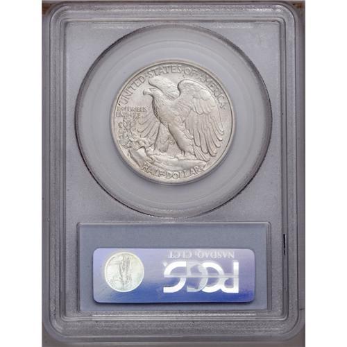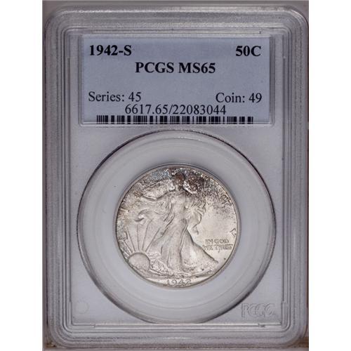<B>1942-S<50C> MS65 PCGS.</B></I> Trumpet tail S. Freckles of plum and forest-green toning grace the upper obverse of this lustrous and beautifully unabraded Gem. Moderate softness in the centers is characteristic of the S-mint issue.