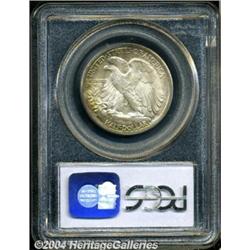 <B>1942-S<50C> MS65 PCGS.</B></I> Peach, ruby-red, sky-blue, and apple-green colors illuminate this lustrous and unabraded Gem. The cheek and skirt lines have typical definition for this San Francisco issue, which is a semi-key to the short set. This piece possesses a Trumpet Tail mintmark, one of three different styles used. <BR><BR><B>Important notice:</B> Heritage usually auctions material at the rate of 200-250 lots per hour. On some occasions eBay Live bid software or the Internet may not be able to keep up with the pace of the auction. We recommend placing a realistic absentee bid now as insurance to avoid disappointment. Occasionally the auctioneer may eliminate or reject an eBay Live bid, and the auctioneer may also reopen a lot after the close of the eBay live bidding (usually because we missed an audience bid), and may reject your bid even if it shows you as the winning bidder. By bidding via eBay Live, you agree that Heritage may award the lot to another bidder at its sole discretion under the circumstances described above or any other reasonable circumstances. Since eBay bids are not shown to us until we open the lot on the floor, we treat those bids just like floor bids. In most cases the floor responds before the eBay bid is presented to us, due to Internet lag time, so for consistency we have made it a policy that floor bids are always considered first over tie eBay live bids. Also please note that all Heritage lots purchased through eBay Live carry a 20% Buyer's Premium. Please make sure you read the Terms and Conditions before you bid. </span></font></tr></table></td></tr></table>