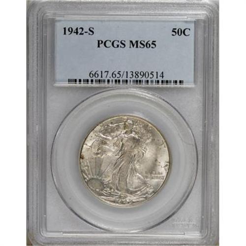 <B>1942-S 50C MS65 PCGS.</B></I> PCGS Population (1903/285). NGC Census: (948/157). Mintage: 12,708,000. Numismedia Wsl. Price for NGC/PCGS coin in MS65: $464. (#6617)<BR><BR><B>Coin Engraver:</B> Adolph A. Weinman<BR><BR><b>Shipping:</b> Coins & Currency (<a target="_blank" href="http://www.heritageauctions.com/common/shipping.php">view shipping information</a>\)