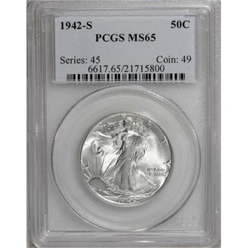 <B>1942-S 50C MS65 PCGS.</B></I> PCGS Population (1911/291). NGC Census: (948/157). Mintage: 12,708,000. Numismedia Wsl. Price for NGC/PCGS coin in MS65: $464. (#6617)<BR><BR><B>Coin Engraver:</B> Adolph A. Weinman<BR><BR><b>Shipping:</b> Coins & Currency (<a target="_blank" href="http://www.heritageauctions.com/common/shipping.php">view shipping information</a>\)