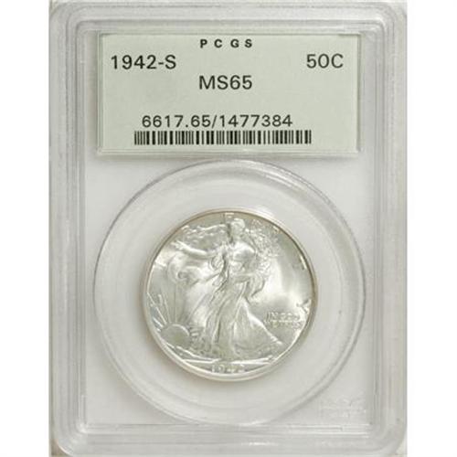 <B>1942-S 50C MS65 PCGS.</B></I> PCGS Population (1911/291). NGC Census: (948/157). Mintage: 12,708,000. Numismedia Wsl. Price for NGC/PCGS coin in MS65: $464. (#6617)<BR><BR><B>Coin Engraver:</B> Adolph A. Weinman<BR><BR><b>Shipping:</b> Coins & Currency (<a target="_blank" href="http://www.heritageauctions.com/common/shipping.php">view shipping information</a>\)