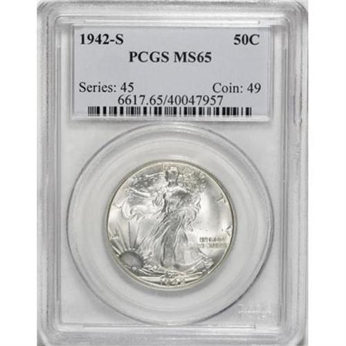 <B>1942-S 50C MS65 PCGS.</B></I> PCGS Population (1923/295). NGC Census: (952/157). Mintage: 12,708,000. Numismedia Wsl. Price for NGC/PCGS coin in MS65: $464. (#6617)<BR><BR><B>Coin Engraver:</B> Adolph A. Weinman<BR><BR><b>Shipping:</b> Coins & Currency (<a target="_blank" href="http://www.heritageauctions.com/common/shipping.php">view shipping information</a>)