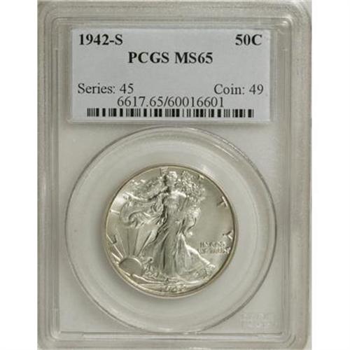 <B>1942-S 50C MS65 PCGS.</B></I> PCGS Population (1926/296). NGC Census: (952/157). Mintage: 12,708,000. Numismedia Wsl. Price for NGC/PCGS coin in MS65: $464. (#6617)<BR><BR><B>Coin Engraver:</B> Adolph A. Weinman<BR><BR><b>Shipping:</b> Coins & Currency (<a target="_blank" href="http://www.heritageauctions.com/common/shipping.php">view shipping information</a>)