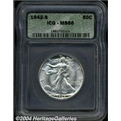 <table><tbody><tr><td><table> <TR><TD width="100%"><TABLE cellSpacing=1 cellPadding=3 width="100%" border=0><TBODY><TR><TD width="100%" bgColor=#79735c><FONT face=arial color=#ffffff size=3><B>Description</B> </FONT></TD></TR><TR><TD width="100%" bgColor=#ffffff><FONT face=arial size=2><B>1942-S 50C MS66 ICG.</B></I> The '42-S is among the more sought-after issues in the short set of Walking Liberty Halves, and only a small percentage possess the strength of strike and clean surfaces required of a Superb example. This bright, satiny-white Gem is very well struck for the issue and its vibrant surfaces are particularly smooth. </FONT></TD></TR></TBODY></TABLE></TD></TR></TBODY></TABLE><BR><A name=PricesRealized></A><TABLE cellSpacing=0 cellPadding=0 width="100%" bgColor=#000000 border=0><TBODY><TR><TD width="100%"><TABLE cellSpacing=1 cellPadding=3 width="100%" border=0><TBODY><TR><TD width="100%" bgColor=#79735c><A name=PR><FONT face=arial color=#ffffff size=3><B>Previous Prices from Heritage Auctions</B> </FONT></A></TD></TR><TR><TD bgColor=#f6f6ed><TABLE cellSpacing=0 cellPadding=0 width="100%" border=1><TBODY><TR><TD align=middle width="33%"><B>Date</B></TD><TD align=middle width="33%"><B>Service</B></TD><TD align=middle width="33%"><B>Price</B></TD></TR><TR bgColor=whitesmoke><TD width="33%"><B>11/25/2003</B></TD><TD width="33%">PCGS</TD><TD width="33%">$3,105.00</TD></TR><TR bgColor=whitesmoke><TD width="33%"><B>11/12/2002</B></TD><TD width="33%">NGC</TD><TD width="33%">$2,185.00</TD></TR><TR bgColor=whitesmoke><TD width="33%"><B>01/01/2002</B></TD><TD width="33%">NGC</TD><TD width="33%">$1,300.00</TD></TR><TR bgColor=whitesmoke><TD width="33%"><B>04/03/2001</B></TD><TD width="33%">PCGS</TD><TD width="33%">$1,700.00</TD></TR><TR bgColor=whitesmoke><TD width="33%"><B>01/07/2004</B></TD><TD width="33%">PCGS</TD><TD width="33%">$3,910.00</TD></TR><TR bgColor=whitesmoke><TD width="33%"><B>01/11/2003</B></TD><TD width="33%">PCGS</TD><TD width="33%">$2,415.00</TD></TR><TR bgColor=whitesmoke><TD width="33%"><B>11/23/2002</B></TD><TD width="33%">PCGS</TD><TD width="33%">$2,415.00</TD></TR><TR bgColor=whitesmoke><TD width="33%"><B>04/27/2002</B></TD><TD width="33%">PCGS</TD><TD width="33%">$2,070.00</TD></TR><TR bgColor=whitesmoke><TD width="33%"><B>08/07/2000</B></TD><TD width="33%">PCGS</TD><TD width="33%">$1,322.50</TD></TR><TR bgColor=whitesmoke><TD width="33%"><B>03/18/1998</B></TD><TD width="33%">NGC</TD><TD width="33%">$654.50</TD></TR><TR bgColor=whitesmoke><TD width="33%"><B>02/13/1998</B></TD><TD width="33%">NGC</TD><TD width="33%">$687.50</TD></TR><TR bgColor=whitesmoke><TD width="33%"><B>02/13/1998</B></TD><TD width="33%">NGC</TD><TD width="33%">$737.00</TD></TR><TR bgColor=whitesmoke><TD width="33%"><B>01/10/1998</B></TD><TD width="33%">NGC</TD><TD width="33%">$805.00</TD></TR><TR bgColor=whitesmoke><TD width="33%"><B>01/11/1997</B></TD><TD width="33%">NGC</TD><TD width="33%">$471.50</TD></TR><TR bgColor=whitesmoke><TD width="33%"><B>10/26/2000</B></TD><TD width="33%">NGC</TD><TD width="33%">$748.00</TD></TR><TR bgColor=whitesmoke><TD width="33%"><B>03/21/2002</B></TD><TD width="33%">PCGS</TD><TD width="33%">$1,840.00</TD></TR><TR bgColor=whitesmoke><TD width="33%"><B>05/01/2001</B></TD><TD width="33%">PCGS</TD><TD width="33%">$1,552.00</TD></TR><TR bgColor=whitesmoke><TD width="33%"><B>10/01/1998</B></TD><TD width="33%">PCGS</TD><TD width="33%">$1,375.00</TD></TR><TR bgColor=whitesmoke><TD width="33%"><B>08/01/1999</B></TD><TD width="33%">PCGS</TD><TD width="33%">$1,438.00</TD></TR><TR bgColor=whitesmoke><TD width="33%"><B>03/01/1997</B></TD><TD width="33%">PCGS</TD><TD width="33%">$880.00</TD></TR></TBODY></TABLE></TD></TR><TR><TD bgColor=#ffffff><FONT face=arial size=1 ?>PLEASE NOTE: All prices realized reflect the final hammer price PLUS the buyer's premium in auctions that charge a buyer's premium. Each item has a notation at the top of the listing indicating whether that lot included a buyer's premium. Example: A item that sells with a final hammer price of $100 and a 20% buyer's premium will display with a price realized of $120. All information listed is intended to be as accurate as possible, but errors are possible. Please use this guide carefully and inform us of any inaccuracies. </FONT></TD></TR></TBODY></TABLE></TD></TR></TBODY></TABLE><BR><TABLE cellSpacing=0 cellPadding=0 width="100%" bgColor=#000000 border=0><TBODY><TR><TD width="100%"><TABLE cellSpacing=1 cellPadding=3 width="100%" border=0><TBODY><TR><TD width="100%" bgColor=#79735c colSpan=6><FONT face=arial color=#ffffff size=3><B>Price Guide*</B> </FONT></TD></TR><TR bgColor=#f6f6ed><TD align=middle><B>Grade</B> </TD><TD align=middle><B>Coin World<BR>(Trends)</B> </TD><TD align=middle><B>Numismedia<BR>Retail</B> </TD><TD align=middle><B>Numismedia<BR>Wholesale</B> </TD><TD align=middle><B>Coin<BR>Universe</B> </TD><TD align=middle><B>Heritage<BR>Value Index</B> </TD></TR><TR bgColor=#ffffff><TD align=middle>65</TD><TD align=right>$800.00</TD><TD align=right>$700.00</TD><TD align=right>$560.00</TD><TD align=right>$975.00</TD><TD align=right>$551.00</TD></TR><TR style="FONT-WEIGHT: bold" bgColor=#cccfdd><TD align=middle>66</TD><TD align=right>$3,500.00</TD><TD align=right>---</TD><TD align=right>$2,225.00</TD><TD align=right>$3,650.00</TD><TD align=right>$2,541.67</TD></TR><TR bgColor=#ffffff><TD align=middle>67</TD><TD align=right>---</TD><TD align=right>---</TD><TD align=right>$6,000.00</TD><TD align=right>---</TD><TD align=right>---</TD></TR><TR bgColor=#ffffff><TD colSpan=6><FONT size=1>*All information listed is intended to be as accurate as possible, but errors are possible. No item may be returned or refused based on this information which is provided as a service to our customers. You should contact each pricing source directly to determine the accuracy of this information. </FONT></TD></TR></TBODY></TABLE></TD></TR></TBODY></TABLE><BR><TABLE cellSpacing=0 cellPadding=0 width="100%" bgColor=#000000 bor