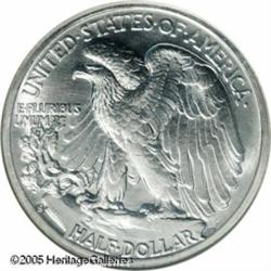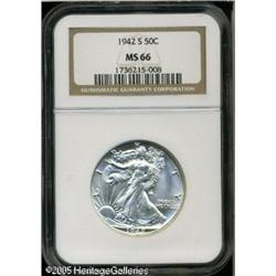 <B>1942-S 50C MS66 NGC.</B></I> Trumpet Tail S. A brilliant and exceptionally undisturbed premium Gem. The strike is above average, since the upper skirt lines show some definition. The connoisseur of quality will cherish this beautiful example, since the issue is essentially unobtainable any finer. Lot:8126