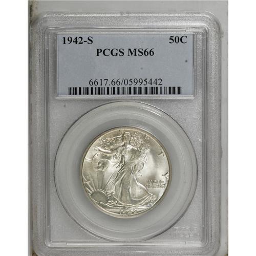 <B>1942-S 50C MS66 PCGS.</B></I> A highly lustrous piece that has light golden toning. Well-preserved with an adequate strike. PCGS has graded just one example finer (10/06).<BR><BR><b>Shipping:</b> Coin/Currency (<a target="_blank" href="http://www.heritageauctions.com/common/shipping.php">view shipping information</a>)