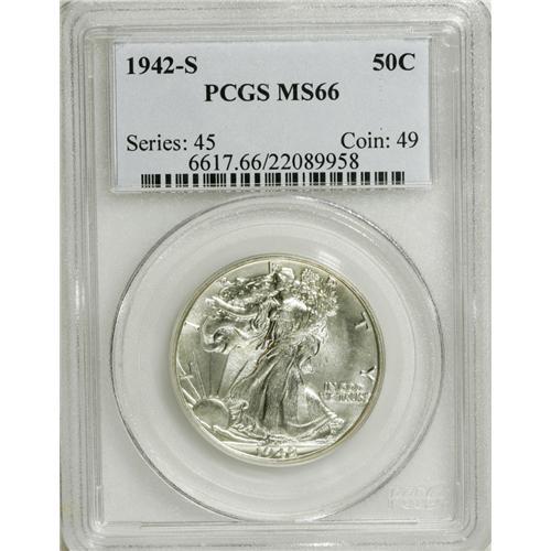 <B>1942-S 50C MS66 PCGS.</B></I> A pretty Premium Gem, strongly lustrous with slightly above-average detail for this popular short-set issue. PCGS has certified just one coin finer (1/07).<BR><BR><b>Shipping:</b> Coins & Currency (<a target="_blank" href="http://www.heritageauctions.com/common/shipping.php">view shipping information</a>)