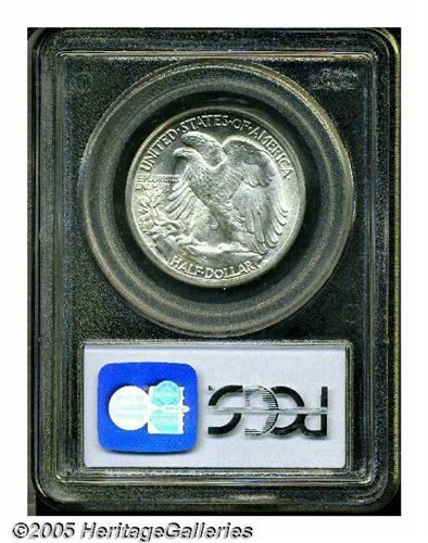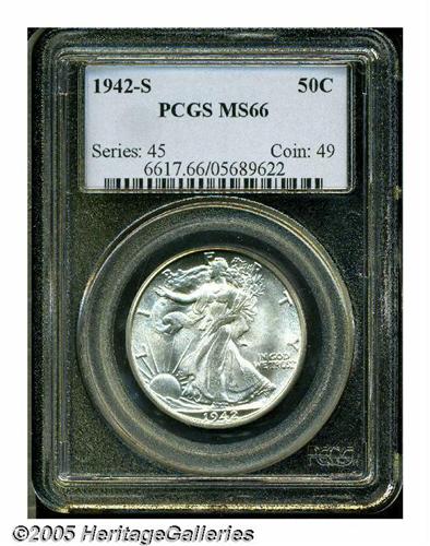 <B>1942-S<50C> MS66 PCGS.</B></I> Like most S-mint Walkers from this era, the '42-S is not known for razor sharp striking definition. Nonetheless, this is a sufficiently bold looking Gem whose surfaces are awash in scintillating mint luster. There are no distracting bagmarks. PCGS has certified one example finer (5/05).