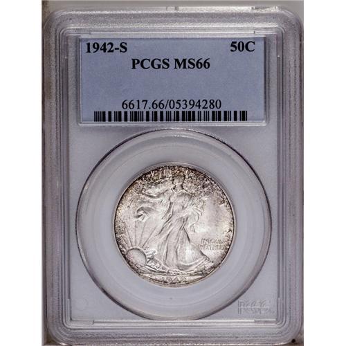 <B>1942-S<50C> MS66 PCGS.</B></I> Satiny white surfaces with crescents of russet-gray toning on each side. Fairly well struck for this difficult issue, which actually has fewer survivors at this Premium Gem level than its better-known cousin, the 1941-S. Opportunity knocks loudly here. PCGS has graded only one specimen finer (3/06). <BR><BR><B>Important notice:</B> Heritage usually auctions material at the rate of 200-250 lots per hour. On some occasions eBay Live bid software or the Internet may not be able to keep up with the pace of the auction. We recommend placing a realistic absentee bid now as insurance to avoid disappointment. Occasionally the auctioneer may eliminate or reject an eBay Live bid, and the auctioneer may also reopen a lot after the close of the eBay live bidding (usually because we missed an audience bid), and may reject your bid even if it shows you as the winning bidder. By bidding via eBay Live, you agree that Heritage may award the lot to another bidder at its sole discretion under the circumstances described above or any other reasonable circumstances. Since eBay bids are not shown to us until we open the lot on the floor, we treat those bids just like floor bids. In most cases the floor responds before the eBay bid is presented to us, due to Internet lag time, so for consistency we have made it a policy that floor bids are always considered first over tie eBay live bids. Also please note that all Heritage lots purchased through eBay Live carry a 20% Buyer's Premium. Please make sure you read the Terms and Conditions before you bid. This lot is being auctioned in conjunction with a live floor auction by Heritage Galleries & Auctioneers. All final auction and invoice information will be supplied by Heritage Galleries & Auctioneers, and all other information should be considered preliminary. Lot:3001 <BR><BR><B>Winning Notification and Billing:</B> After the FINAL session in this auction is complete, Heritage will send e-mail and snail mail invoices. This process normally takes several days. All final auction and invoice information will be supplied by Heritage Galleries & Auctioneers, and all other information should be considered preliminary. <BR><BR>This auction will be conducted on a live auction floor and over the Internet through eBay Live. If you choose to place an absentee bid, please take a moment to <font color='#0000ff'><u><a href='http://pages.ebay.com/liveauctions/help/before/laabsentee.html'>learn how eBay Live absentee bidding works</a></u></font><font color='#000000'>