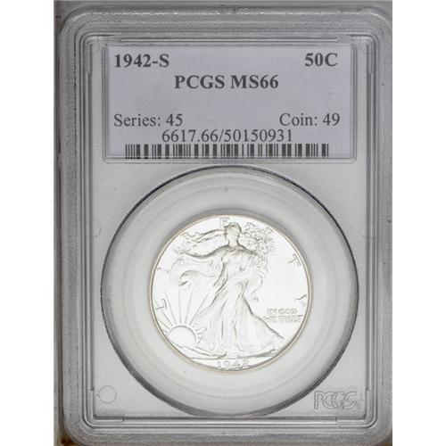 1942-S 50C MS66 PCGS. Small S mintmark, said to be rar 1942-S[50C] MS66 PCGS.