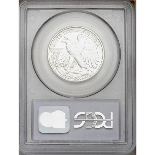 <B>1942-S<50C> MS66 PCGS.</B></I> Small S mintmark, said to be rare by Fivaz. A brilliant and fully lustrous premium Gem, lovingly preserved and gorgeous. The strike is above average for the mint, since Liberty's cheek and upper skirt lines have some definition. Just one finer example of this issue has been certified by PCGS (4/06).