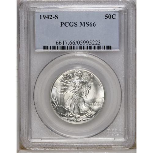 <B>1942-S 50C MS66 PCGS.</B></I> This lovely Premium Gem displays bright luster that exudes from immaculately preserved surfaces. Generally well struck and essentially untoned. The '42-S is elusive in finer levels of preservation.<BR><BR><b>Shipping:</b> Coin/Currency (<a target="_blank" href="http://www.heritageauctions.com/common/shipping.php">view shipping information</a>)