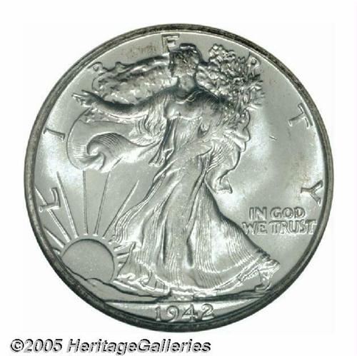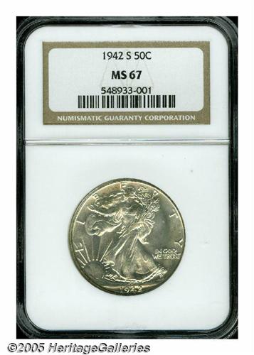 <B>1942-S<50C> MS67 NGC.</B></I> This Superb Gem example is a gorgeous representative of the issue with strong design definition and prooflike surfaces. Without a doubt this was one of the earliest strikes from the die pair. Both sides are fully brilliant and lustrous with golden toning confined to the very rims. Although the central obverse exhibits some weakness, the balance of details on both sides are virtually complete. Population: 3 in 67, 0 finer (6/05).<BR><I>From The Robert Moreno Collection.</B></I>