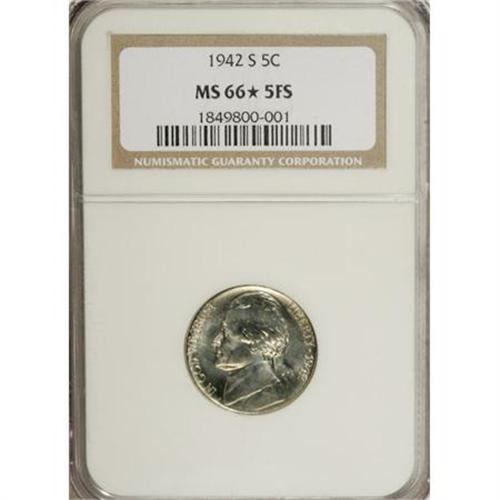 <B>1942-S 5C MS66<img border='0' src='http://www.heritagecoins.com/images/star.gif' width=10 height=10> Full Steps NGC.</B></I> NGC Census: (33/5). PCGS Population (128/9). (#84017)<BR><BR><b>Shipping:</b> Coins & Currency (<a target="_blank" href="http://www.heritageauctions.com/common/shipping.php">view shipping information</a>)