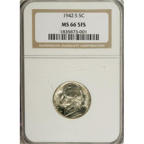 <B>1942-S 5C MS66 Full Steps NGC.</B></I> NGC Census: (33/5). PCGS Population (128/9). (#84017)<BR><BR><b>Shipping:</b> Coins & Currency (<a target="_blank" href="http://www.heritageauctions.com/common/shipping.php">view shipping information</a>)