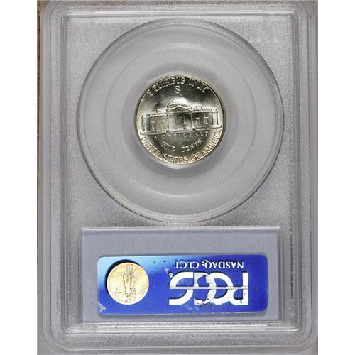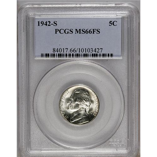 <B>1942-S<5C> MS66 Full Steps PCGS.</B></I> A small patch of olive toning on the reverse adds color to this frosty and otherwise untoned piece. Boldly impressed and quite appealing.