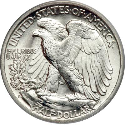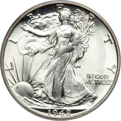 1942-S Liberty Walking Half Dollar. PCGS graded MS-66. A brilliant white gem. Pop 319; 1 in 67. (PCGS # 6617).